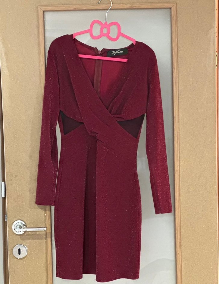 Bordo renk, uzun kollu, V yaka ve drapeli tasarıma sahip dar kesim kadın abiye elbise. Uzun boyu ve koyu tonu romantik akşamlar için uygundur. Esnek yapıya sahiptir. Denemek dışında uzun vakitlice hiç giyilmedi. Tertemiz ve sorunsuzdur.