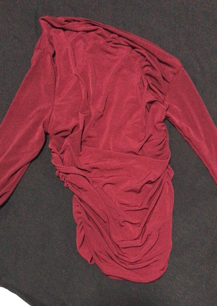 Bordo renk, uzun kollu, drapeli ve tek renk kadın bluz. Vücuda oturan kesimi ve tekne yakası ile midi uzunlukta, parti için uygun goth tarzda.
