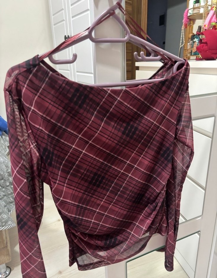Bordo renkte, drapeli ve uzun kollu kadın bluz. Sentetik kumaştan, salaş kesim ve bağlama desenlidir, günlük kullanıma uygundur.