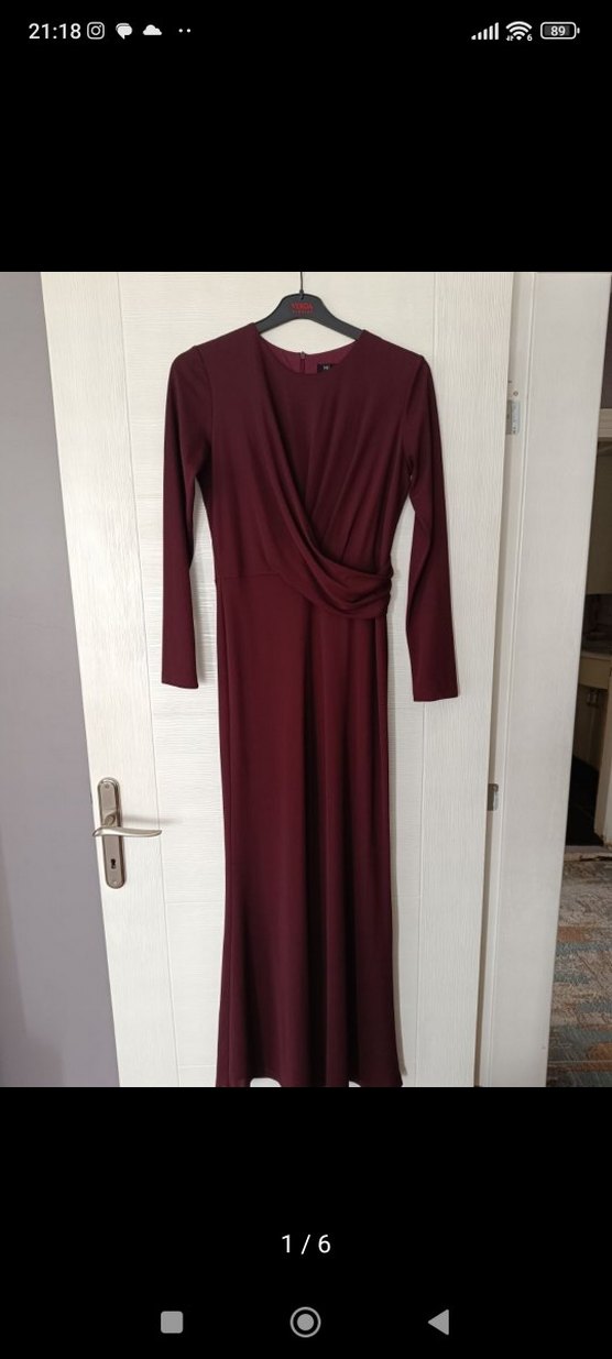 Bordo renkte, drapeli ve V yaka detaylı, uzun kollu, vücuda oturan kadın elbisesi. Modern klasik tarzda, sentetik kumaştan üretilmiştir, romantik akşamlar için uygundur.