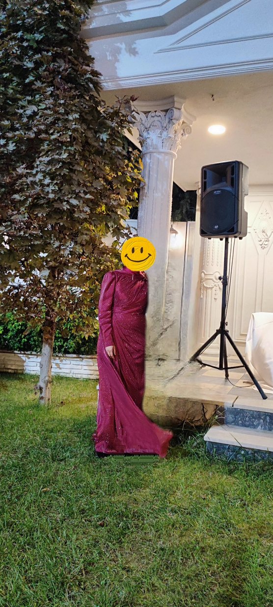 Bordo renkli, yüksek yakalı ve uzun kollu bu uzun elbise drapeli tasarımı ve parlak batik deseniyle dikkat çekiyor. 168 boy 70 kilo ile giydim