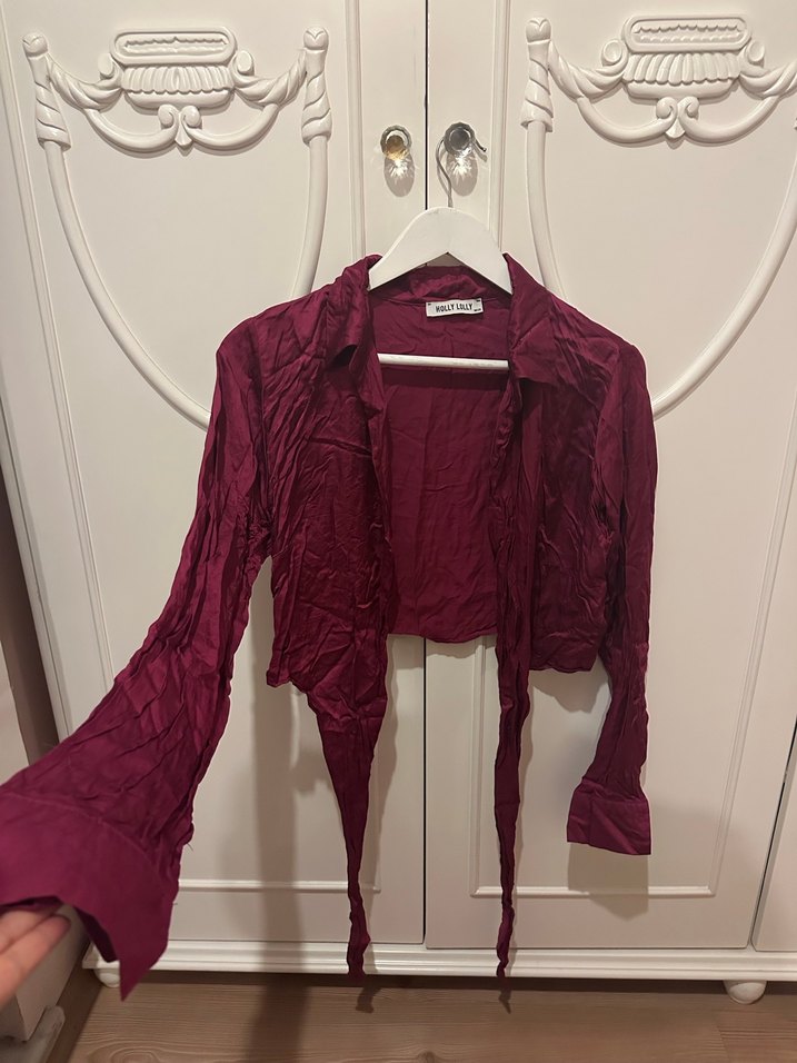 Bordo renkli, keten kumaştan yapılmış, drapeli ve halter yakalı uzun kollu, bohem tarzda kadın gömleği. Günlük kullanıma uygundur.