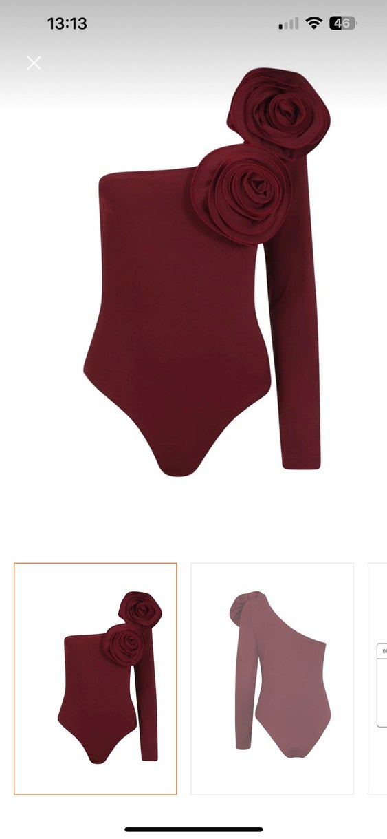Bordo renkli, uzun kollu ve drapeli tasarıma sahip, tek omuzda büyük çiçek detayı bulunan iddialı kesim mayo.