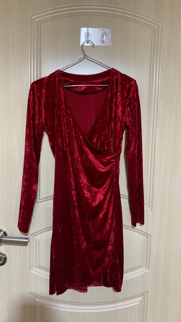 Bordo renkli, V yakalı ve uzun kollu, drapeli tasarıma sahip, vücuda oturan midi boy gece elbisesi. Cesur gotik tarzıyla romantik akşamlar için uygun.