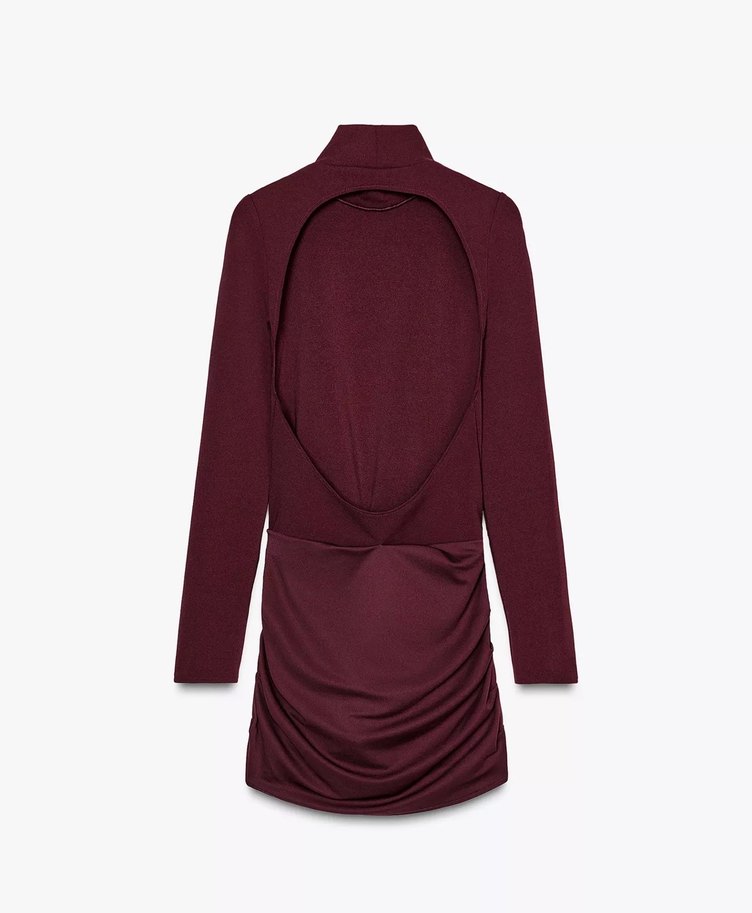 Bordo renkli, uzun kollu, yüksek yakalı ve drapeli sırt detaylı triko elbise. Fitted kesimi ve midi boyu ile romantik akşamlar için uygundur.