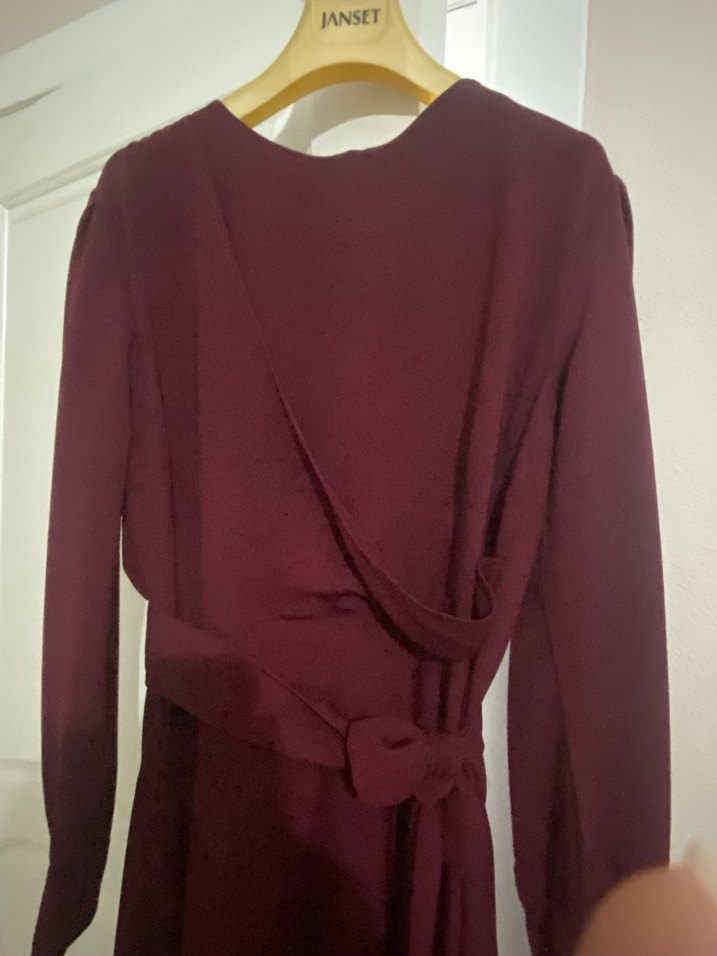 Bordo uzun elbise, uzun kolludur İpek gibi kumaştan, drapeli detaylı ve vücuda oturan modern klasik tarzda.