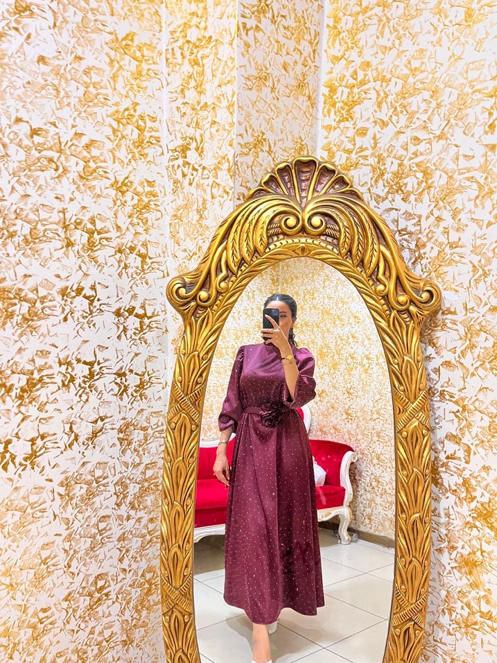 Bordo Drapeli Uzun Kollu Uzun Elbise