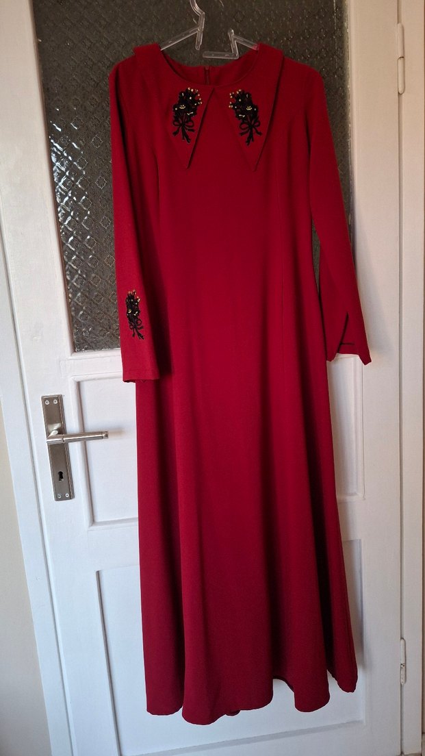 Bordo renkte, uzun kollu ve yüksek yakalı, drapeli tasarıma sahip uzun elbise. İpek gibi kumaştan, bol kesim ve vintage goth detaylarla romantik akşamlar için uygun. Elbise bir bedendir seçeneği olmadığından 38 beden işaretlenmiştir.
