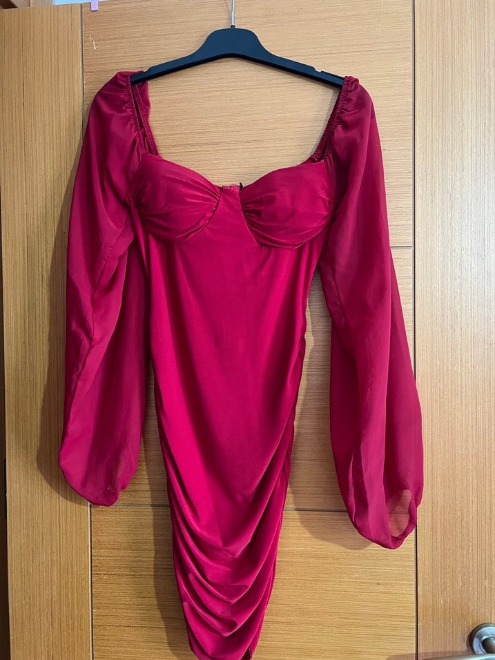 Bordo renkli, drapeli ve uzun kollu bu abiye elbise, v yaka ve dar kesime sahiptir. Güncel tarzı ve koyu desenli kumaşı romantik gece için idealdir.