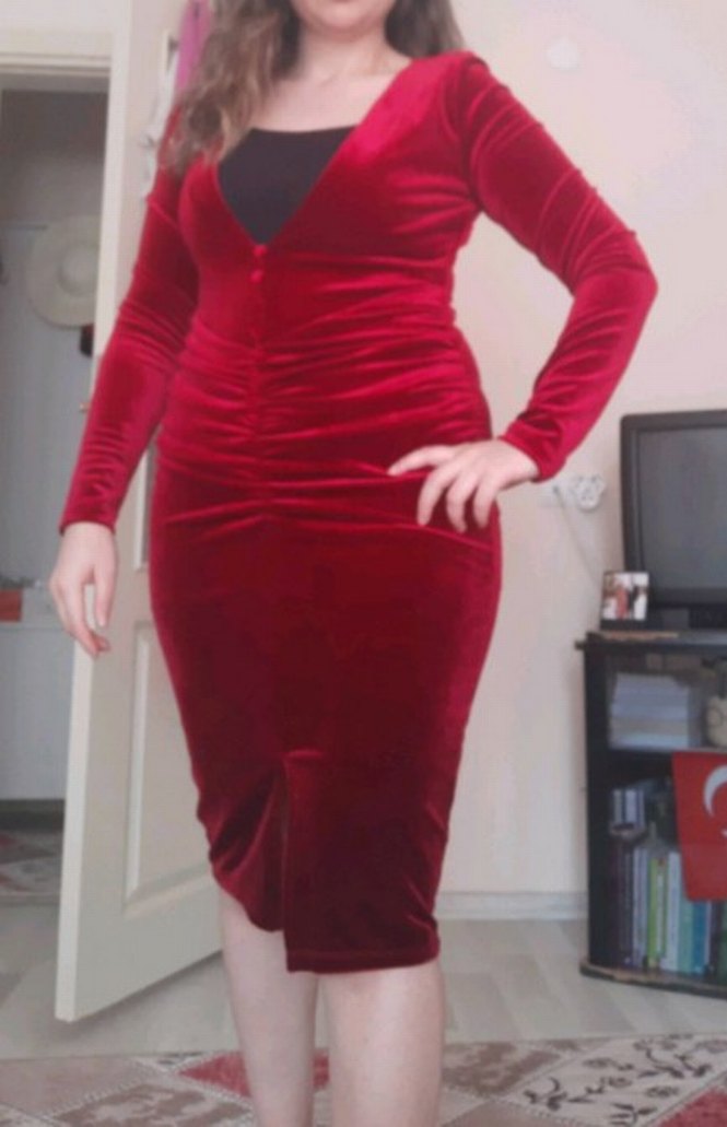 Bordo renkte, derin V yakalı, uzun kollu ve drapeli detaylara sahip, vücuda oturan kadın abiye elbise. Romantik gece için gösterişli ve cesur tercih. bikaç kez giyildi l bedendir. boy 99-100 cm bel 34 cm iki kol arası mesafe 45 cm v yakanın derinliği 28-29 cm kilo aldığım için satıyorum 62 kiloda giyildi şuanda daha kilolu olduğum için satıyorum