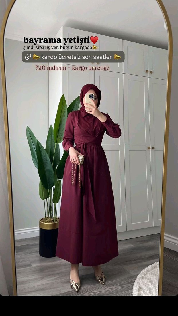 Bordo renk, uzun kollu ve yüksek yakalı bu elbise, drapeli ve salaş kesimiyle günlük kullanıma uygundur. Yumuşak ve parlak kumaştan üretilmiştir. %10 indirim ve kargo ücretsiz fırsatı mevcut.