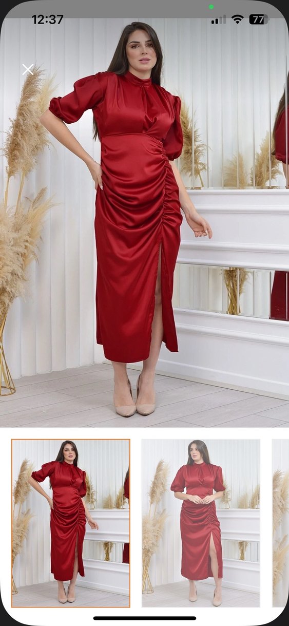 Kırmızı saten kumaştan, drapeli tasarımı vardır temiz kullanıldı herhangi bir sorunu yoktur bir kere kullanılmıştır