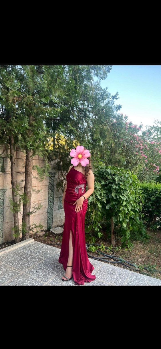 Bordo renkli, straplez yaka ve drapeli detaylara sahip uzun, çiçek desenli, bohem tarzda abiye elbise.
