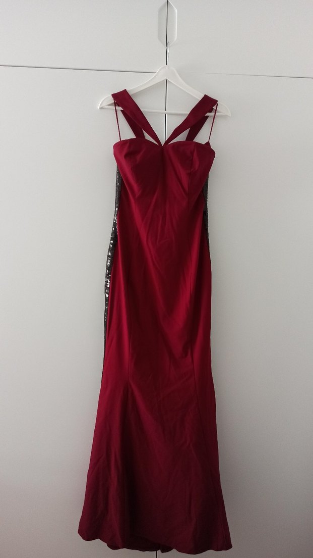 Bordo renkte, straplez yakalı ve drapeli tasarıma sahip, uzun ve dar kesim abiye elbise. Romantik akşamlar için uygun, gotik tarzda şık bir model.