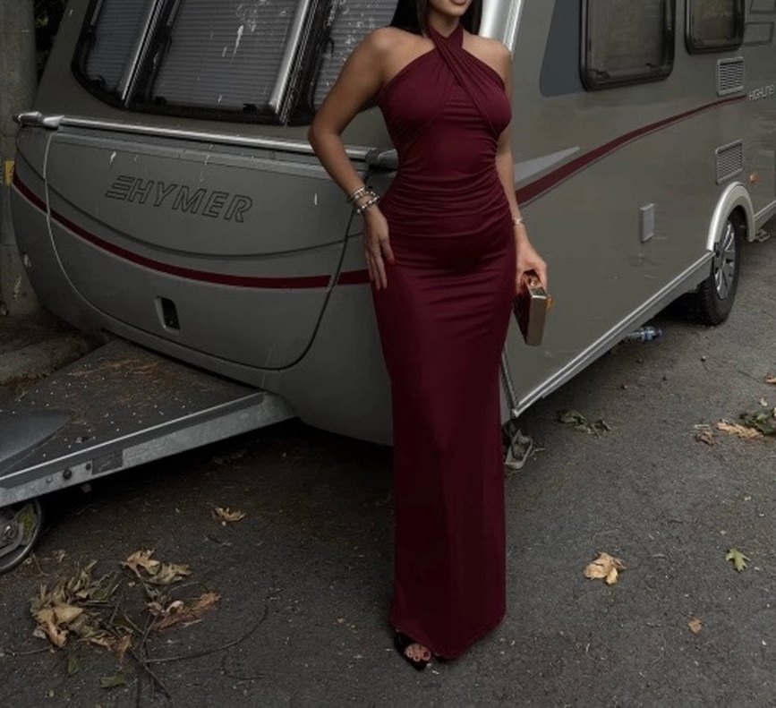 Bordo renk, drapeli ve straplez tasarıma sahip, ince ve uzun kesimli, ipeksi dokulu elbise. Romantik akşamlar için uygundur. ✨