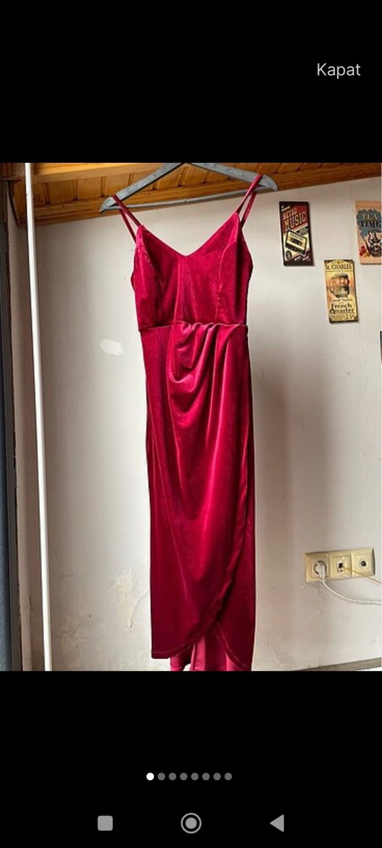 Bordo parlak renkte, drapeli uzun ve v yaka, kolsuz, vücuda oturan elbisedir.
