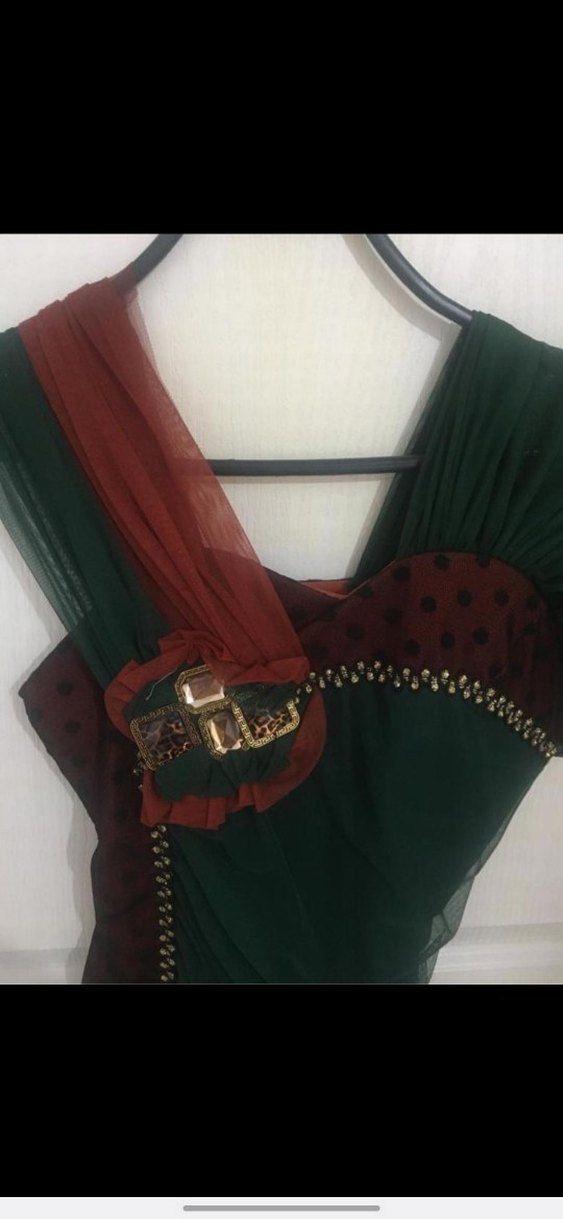 Bordo renkte, uzun ve vücuda oturan bu elbise, kayık yaka ve kolsuz tasarımıyla dikkat çeker. Drapeli detayları ve desenli bohem stili düğünler için uygundur.