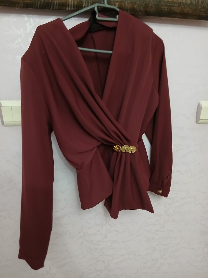 Bordo renkte, drapeli tasarıma sahip, uzun kollu ve vücuda oturan kesimde, ipeksi ve parlak kumaştan üretilmiş midi boy bluz. V yaka ile modern klasik ofis stiline uygundur. ✨