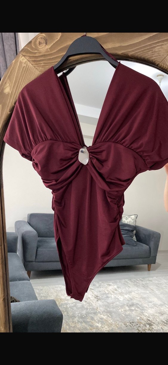 Bordo renkte, drapeli ve V yaka kesime sahip, ince ve parlak kumaştan yapılmış, kolsuz ve vücuda oturan kadın bluz. Parti için uygun.