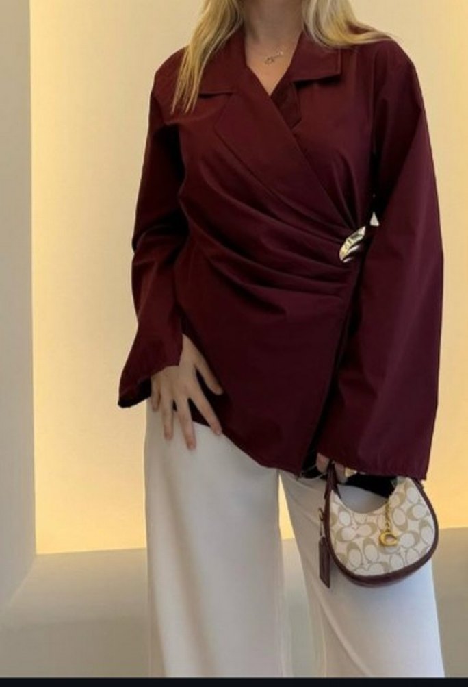 Bordo parlak renkli, drapeli tasarımlı ve V yakalı kadın gömleği. Uzun kollu, bol kesim ve midi boyda, günlük kullanıma uygun ipeksi kumaştan. 1 kere giyildi