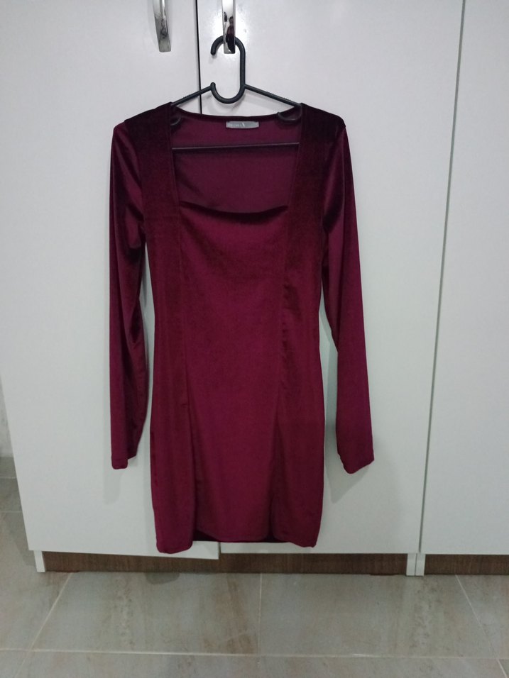 Bordo renkli, uzun kollu, V yakalı ve drapeli detaylara sahip fitted midi elbise, minimalist ve şık sokak stili sunar. Günlük kullanıma uygundur.