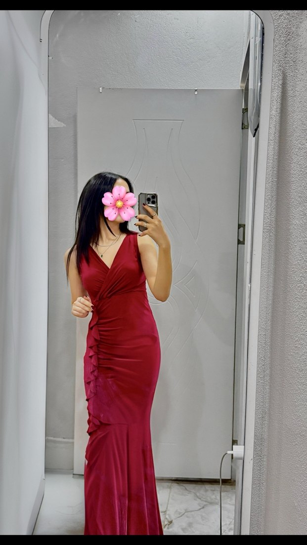 Bordo, parlak ve ipeksi kumaştan, drapeli ve V yakalı, askılı kollu, bağlama desenli, vücuda oturan midi elbise. Romantik akşamlar için uygun.