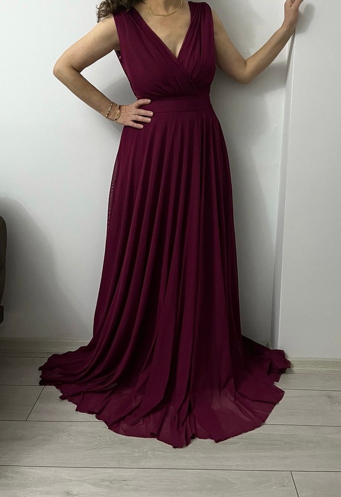 Bordo uzun abiye elbise, drapeli tasarım, V yaka ve ince askılı. Salaş kesim ve modern klasik stilde, düğünler için uygun. ✨