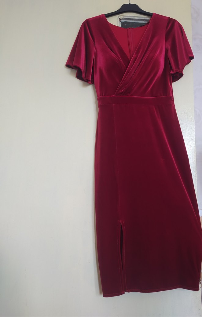Bordo renkli, drapeli ve V yakalı, kısa kollu uzun elbise. Parlak sentetik kumaştan, romantik akşamlar için uygun.
