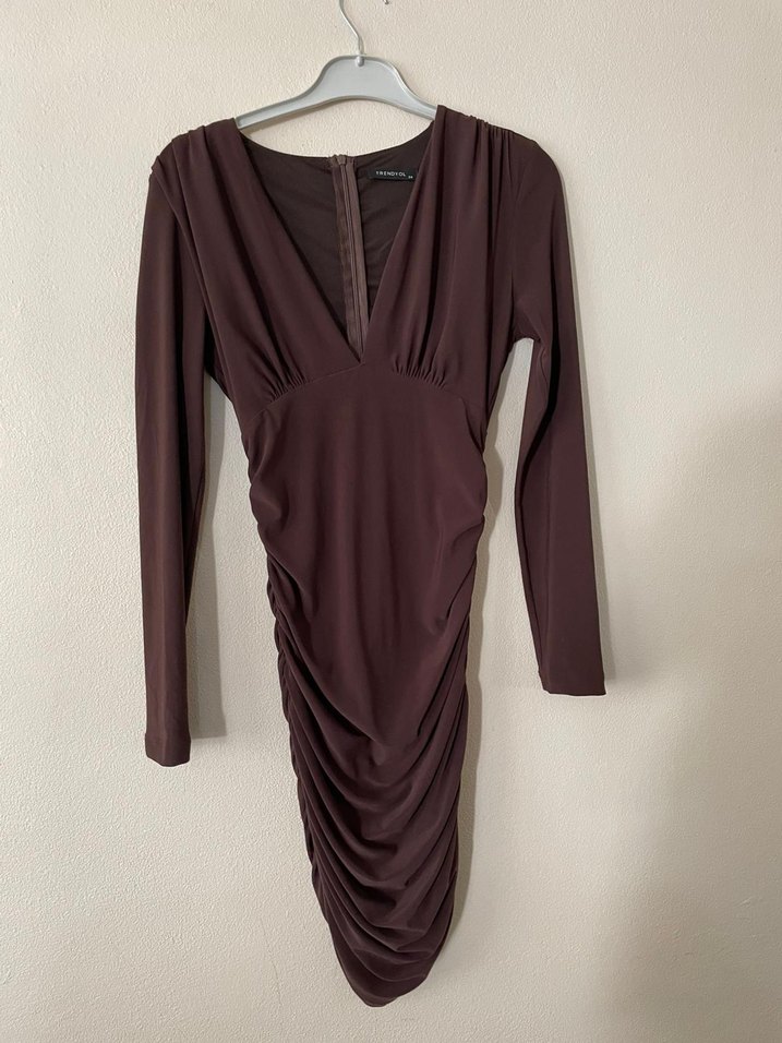 Bordo renk, V yaka ve uzun kollu, drapeli detaylara sahip modern ve minimalist kesim fit elbise. Cesur günlük stil için uygun.