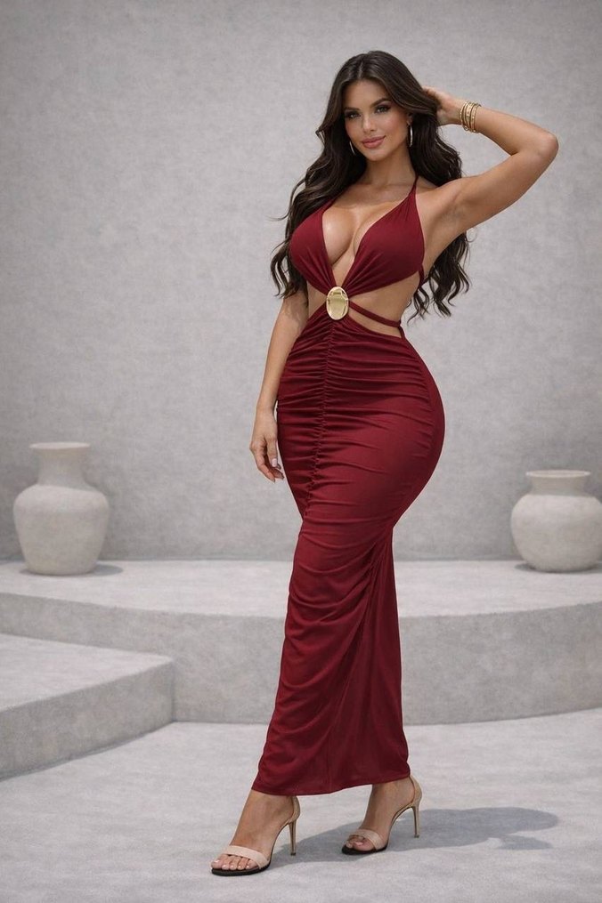 Parlak bordo, drapeli ve V yakalı uzun saten elbise, ince askılı ve vücuda oturan kesimiyle dikkat çeker. Romantik gece için uygundur. Likralı esnek kumaş aksesuar detaylı elbise S M L bedenleri mevcuttur.
