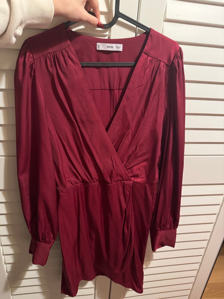 Bordo renkli, drapeli tasarımlı ve V yakalı, uzun kollu, normal mini boyda, ince dokulu. Romantik akşamlar için uygundur .
