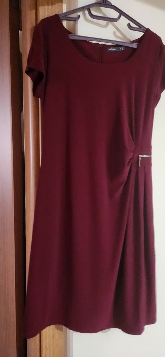 Bordo renkte, drapeli ve V yakalı kadın elbisesi, klasik ve minimal şıklığı yansıtır. Ofis için uygun, kolsuz ve vücuda oturan kesim. ikiler marka