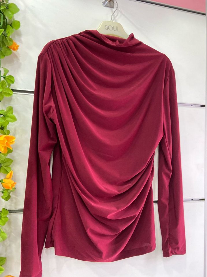 Bordo ve kahverengi renkli yüksek yakalı ve uzun kollu bu dar kesim kadın bluz, yumuşak sentetik kumaştan ve çağdaş drapeli tasarımla üretilmiştir. Minimalist ofis stiline uygundur.
