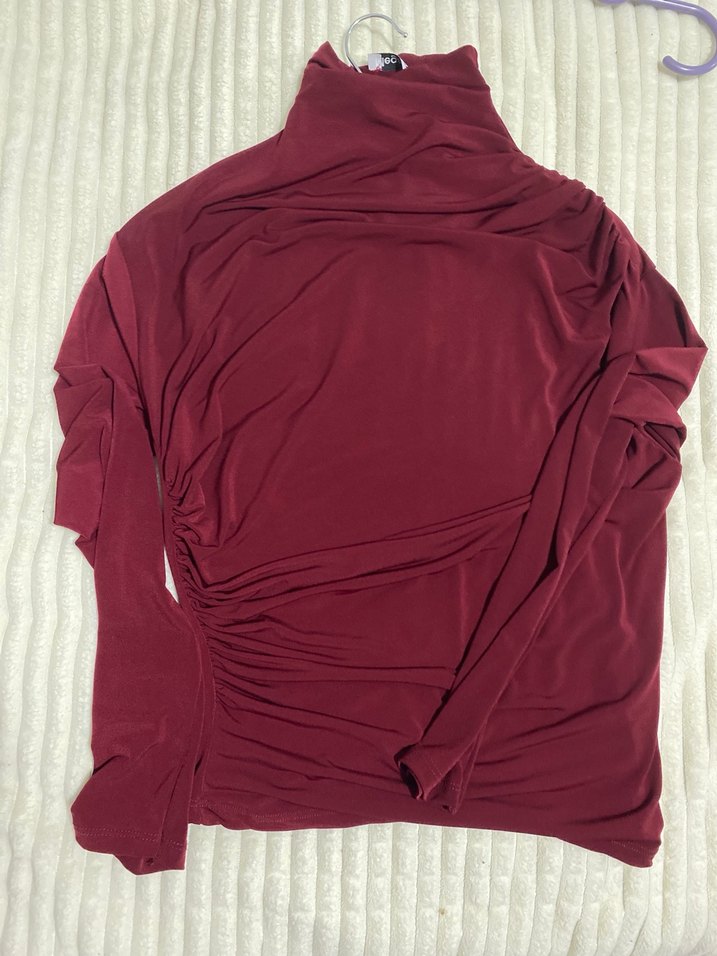 Bordo renkte, yüksek yakalı ve uzun kollu, drapeli detaylı, vücuda oturan kadın bluz. Yumuşak sentetik kumaştan üretilmiştir ve günlük kullanıma uygundur.