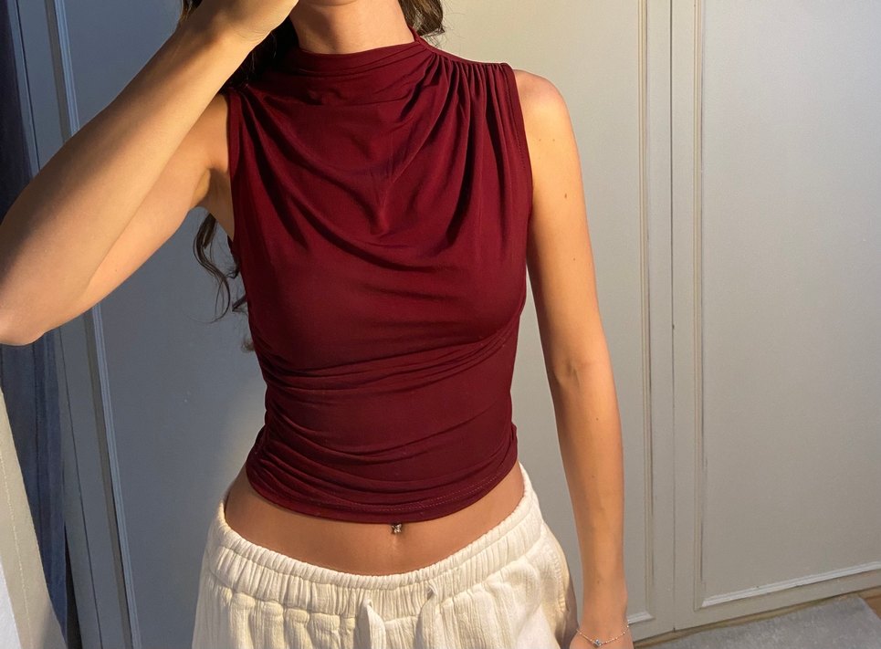 Bordo renkli, kolsuz, yüksek yakalı ve drapeli tasarıma sahip, keten kumaştan yapılmış dar kesim bluz. Cesur sokak stili için ideal.