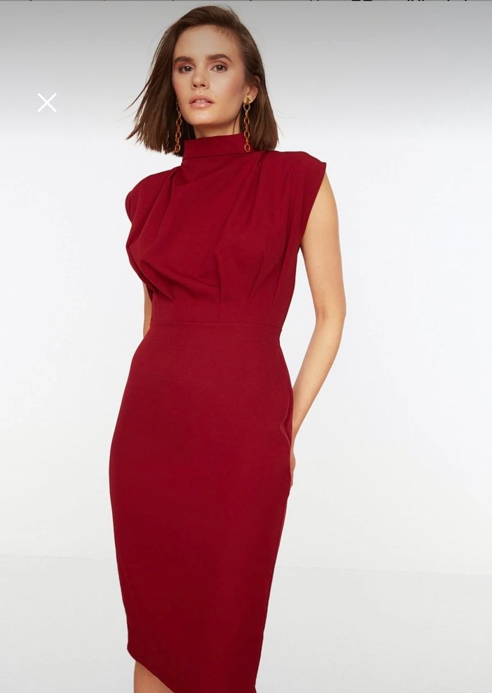 Bordo renkli, drapeli ve yüksek yakalı, kolsuz, midi boy kadın elbise. Bi kez tek giyildi deposuz