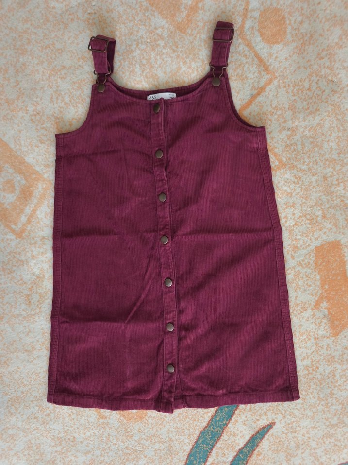 Bordo renkte, düğmeli ön tasarıma sahip askısız, kolsuz kız elbisesi. Gevşek kesim ve bohem tarzda, sentetik kumaştan üretilmiştir.