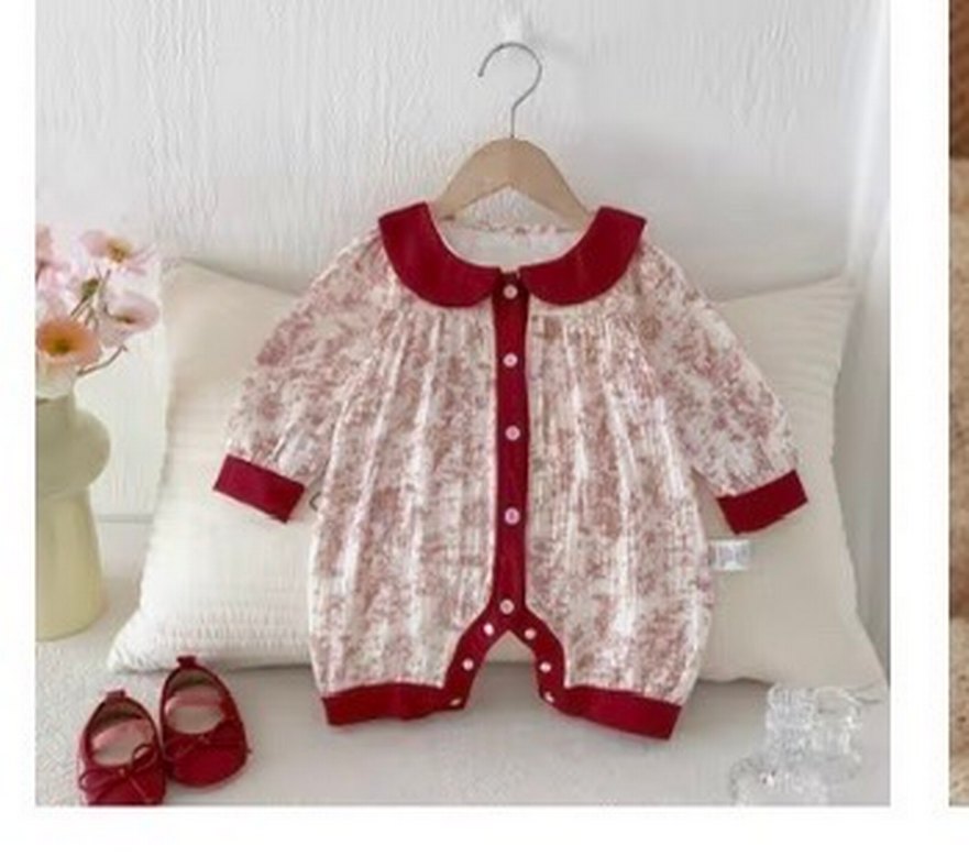 Bordo renkli, pastel tonlarda batik desenli, düğmeli bebek kız tulumu. Uzun kollu ve yuvarlak yakalıdır. 3-6 ay