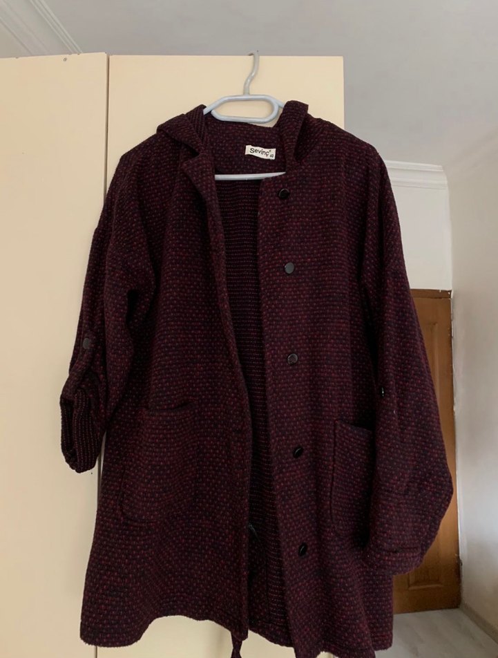 Bordo renkli, yün kumaştan yapılmış, düğmeli ve uzun kollu midi hamile kaban. Rahat kesimi ve şal yaka detayıyla günlük kullanıma uygundur.
