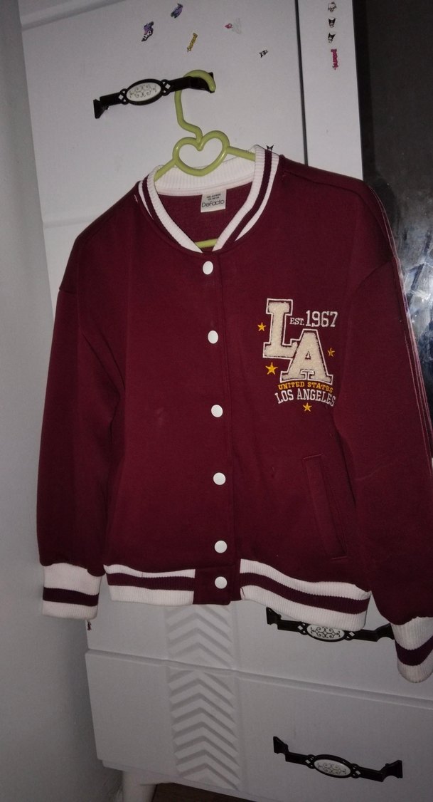 Bordo renkli, uzun kollu, düğmeli çocuk ceket. Rahat kesim ve baskılı tasarım. Yumuşak ve sıcak kumaştan, günlük kullanıma uygun. '1967' ve 'Los Angeles' baskılı.
