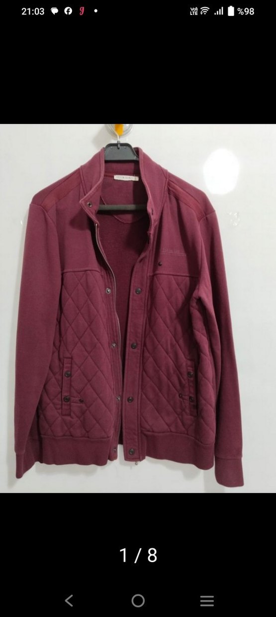 Bordo renkli, düğmeli ve uzun kollu erkek ceket. Normal kesim, sentetik kumaş ve kapitone detaylarla günlük sokak stili için uygundur.