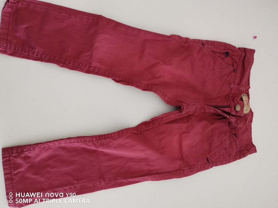 Bordo renkli, bol kesim ve düğmeli erkek çocuk pantolonu. Sentetik kumaştan, düz ve koyu renkte, sokak tarzına uygun.