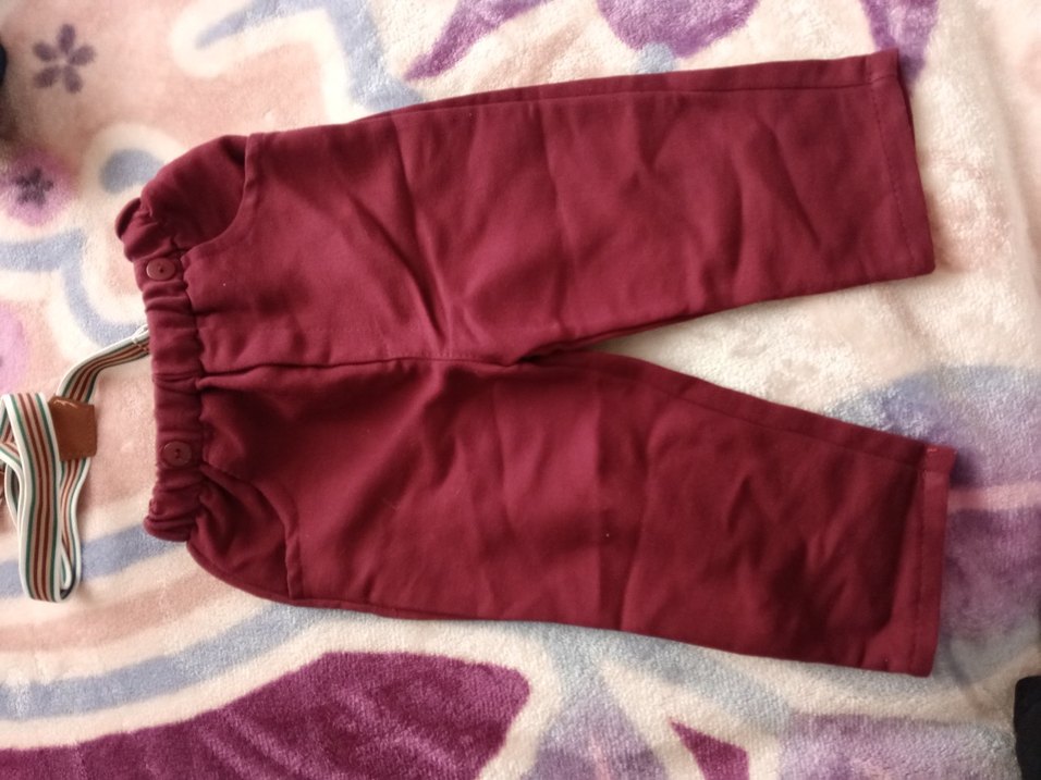 Bordo renkli, düğmeli ve parlak görünümlü erkek çocuk pantolonu, yumuşak ve sıcak kumaştan, sokak tarzına uygun.