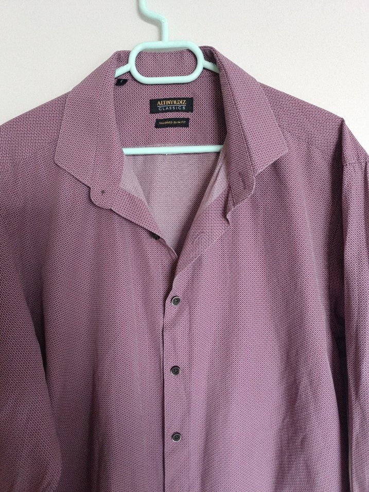 Bordo renginde, düğmeli ve normal boyda erkek gömlek. Notlu yaka ve uzun kollu, sentetik kumaştan yapılmış, ofis kullanımı için uygundur.Iki koltuk arasi 56 cm. On uzunluk 70. Arka uzunluk 73