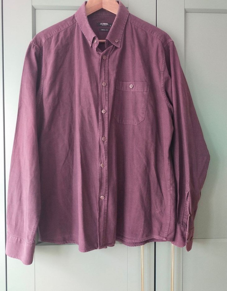 Bordo renkli, uzun kollu keten erkek gömlek. Düğmeli ve yakalı, rahat kesim ve göğüs cebine sahip. Ofis için uygun.
