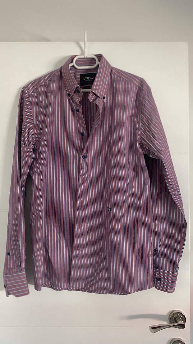 Erkekler için uzun kollu, düğmeli ve kesik yaka detaylı bordo gömlek. Regular fit, ince çizgili deseniyle ofis için uygun, sentetik kumaştan üretilmiştir.