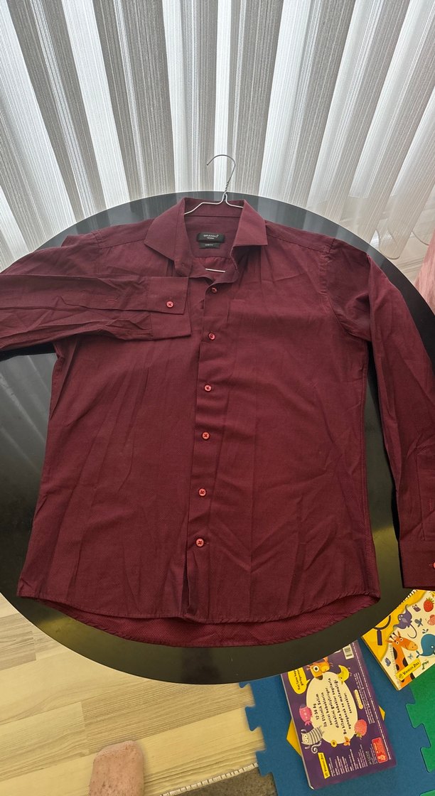 Bordo renkli, düğmeli, uzun kollu ve notalı yaka detaylı erkek gömleği. Sentetik kumaştan üretilmiş, normal boyda ve regular fit kesime sahip. İş ortamı için uygun.