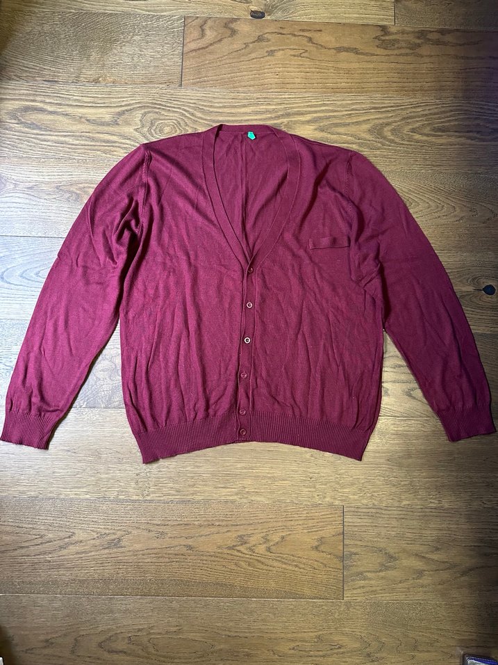 Benetton Bordo renkli, düğmeli, uzun kollu ve rahat kesimli örme erkek hırkası. V yaka ve sade deseniyle günlük kullanıma uygundur.
