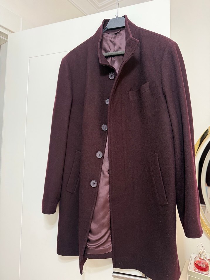Bordo renkli, yün kumaştan yapılmış, düğmeli ve notched lapel yakalı erkek midi kaban. Uzun kollu ve normal kesimdir, ofis ve günlük tarz için uygundur.