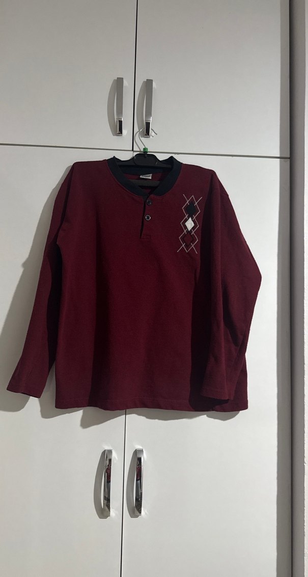 Bordo renkli, uzun kollu ve düğmeli erkek pijama üstü bol kesim ve yuvarlak yaka ile rahat bir kullanım sunar. Göğüs kısmında hafif damalı desen bulunur, yumuşak ve sıcak kumaştan üretilmiştir. İki koltuk arası 58 cm#Boy 66 cm#Kol boyu57 cm#